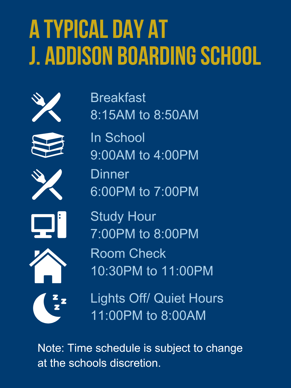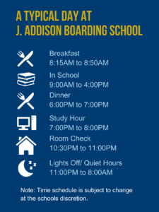 The decision of studying abroad is an exciting one! Understanding that our students are miles away from their families and home countries, J. Addison staff endeavor to provide a safe, comfortable and nurturing living environment which they can call their home away from home. Our Boarding Program is available to students in Grades 7 – 12.